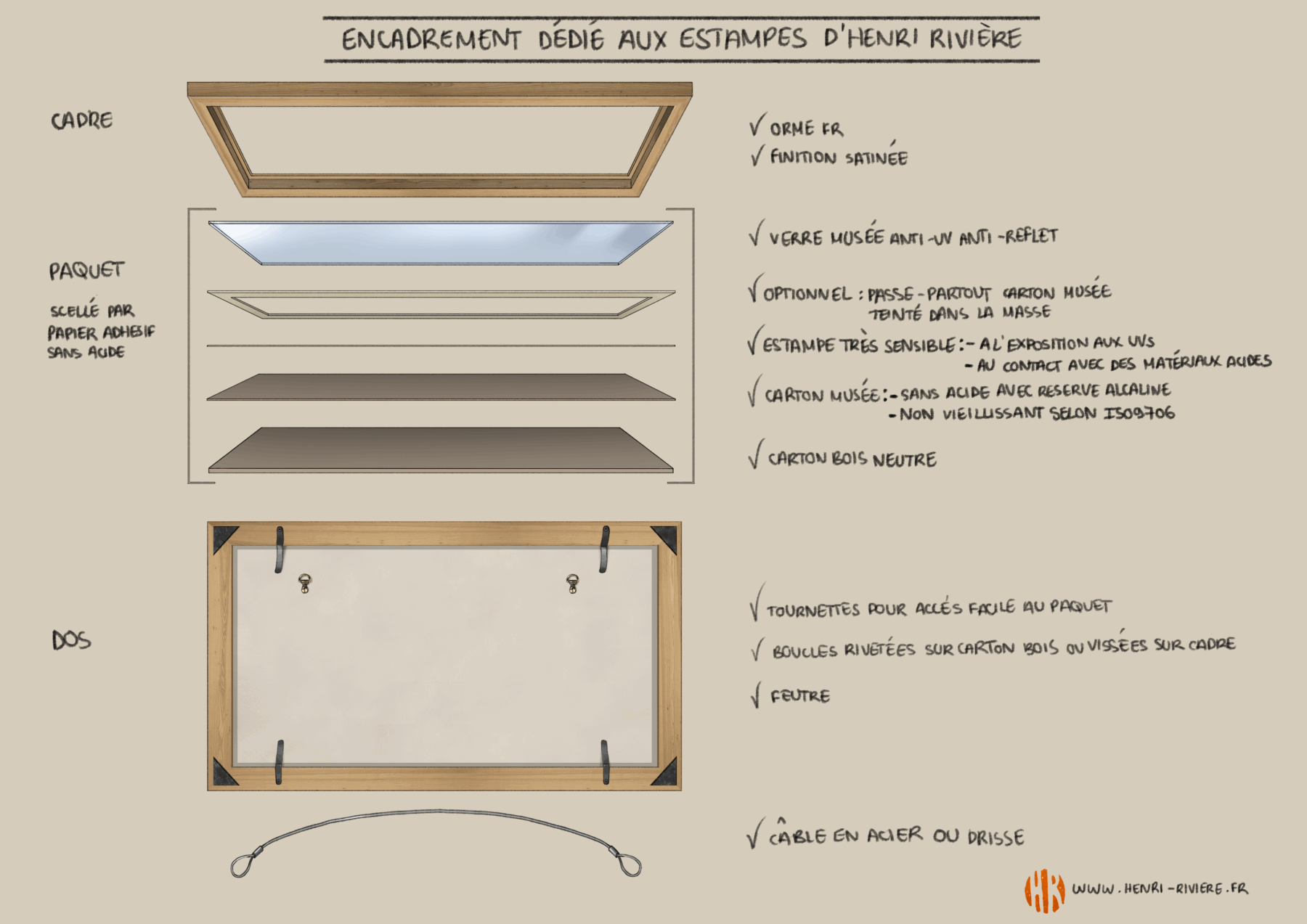 Ainsi nous protégeons l’œuvre du risque de dégradation du papier (piqures principalement), de dégradation des couleurs due aux UV et d’infiltration de poussières et microorganismes.